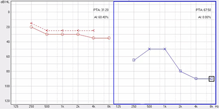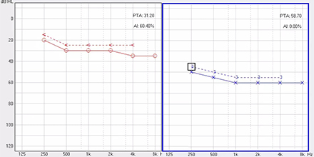 <span style="font-size:16px;"> 純音聽閾測試是聽力學所有測試項目中最基本的一項內容,包括氣導(AC)、骨導(BC)、最舒適閾(MCL)與不舒適閾(UCL)測試。測試結果能夠直接反映患者雙耳的聽力損失程度、性質與動態范圍,還能夠間接反映患者的患病位置、病因與助聽后效果。</span></p><p><span style="font-size:16px;"> 一般地,整個檢查控制在10分鐘左右,既能全面做完檢查,又不至患者疲憊而影響主觀反應。</span></p><p><span style="font-size:16px;"> 純音聽閾測試是最考驗聽力學工作者實際工作能力的一項基本內容:</span></p><p><span style="font-size:16px;"> 1、若患者曾長期暴露于噪聲中,且無其它致聾因素,很可能在3 kHz或6 kHz出現明顯的下降,聽力曲線呈現“V”字形,所以除了常規的倍頻程頻率外,還要加測這兩個頻率,否則就犧牲了多通道助聽器的意義;</span></p><p><span style="font-size:16px;"> 除了有過噪聲接觸史的患者需要加測半倍頻程外,涉及聲場助聽聽閾評估、賠償等情況都需要加測半倍頻程。</span></p><p><span style="font-size:16px;"> 耳鳴困擾的患者,注意避免與耳鳴聲類似的純音,若還用純音作為刺激聲,患者就會分辨不清,出現假陽性或假陰性。所以,測試者要換成囀音,既有別于耳鳴聲,又具有頻率特異性。</span></p><p><span style="font-size:16px;"> 2、不舒適閾反映患者對大聲的忍耐力,不舒適閾與氣導的差值能顯示患者的動態范圍,指導驗配師調節助聽器的最大輸出。</span></p><p><span style="font-size:16px;"> 不舒適閾測試頻率是否越多越好呢?非也。測得頻率過多,一會引起患者疲勞或不適,二是沒必要,大多數助聽器的最大輸出是一個整體,不能像調增益和壓縮那樣分通道,所以測多了并無好處,一般測0.5、1、2、4 kHz。</span></p><p><span style="font-size:16px;"> 3、如果兩側聽力有明顯差異,此時就要準備好掩蔽了,分為氣導掩蔽與骨導掩蔽。</span></p><p><span style="font-size:16px;"> (1)氣導掩蔽的判斷有兩個原則,只要符合其中一個原則,就需要重新測差耳氣導。具體做法是:</span></p><p><span style="font-size:16px;"> 測試完雙耳氣導,若發現某一頻率差耳氣導閾值比好耳氣導閾值多40 dB以上就要懷疑有可能是好耳偷聽的,需要給好耳氣導加掩蔽聲;</span></p><p><span style="font-size:16px;"> 測試完雙耳氣導與好耳骨導,若發現某一頻率差耳氣導閾值比好耳骨導閾值多40 dB以上就要懷疑有可能是好耳偷聽的,需要給好耳氣導加掩蔽聲。</span></p><p><span style="font-size:16px;"> 下面為未掩蔽的聽力圖:</span></p><center><span style="font-size:16px;"><img alt="" src="/upfiles/201810160133207570.png" width="440" height="220" /></span></center><p></p><p><span style="font-size:16px;"> 下圖為掩蔽后的左耳真實氣導值:</span></p><center><span style="font-size:16px;"><img alt="" src="/upfiles/201810160133289538.png" width="440" height="220" /></span></center><p></p><p><span style="font-size:16px;"> (2)骨導掩蔽的判斷原則:</span></p><p><span style="font-size:16px;"> 測試完雙耳氣導與好耳骨導,若發現某一頻率差耳氣導閾值比好耳骨導閾值大于等于15 dB就必須予以掩蔽,重測骨導。下圖為右耳氣導加掩蔽后左耳骨導的真實值:</span></p><center><span style="font-size:16px;"><img alt="" src="/upfiles/201810160133368026.png" width="440" height="220" /></span></center><p></p><p><span style="font-size:16px;"> 注意:</span></p><p><span style="font-size:16px;"> 1)掩蔽的規則要按順序適用;</span></p><p><span style="font-size:16px;"> 2)各頻率根據規則決定是否需要加掩蔽;</span></p><p><span style="font-size:16px;"> 3)很少需要掩蔽所有頻率,通常氣導掩蔽頻率不應超三個,骨導掩蔽頻率不應超兩個,否則受試者會疲憊不堪。</span></p><p><span style="font-size:16px;"> 醫院測聽的主要目的是診斷和鑒別聽力損失的性質和程度,驗配中心的主要目的是盡可能地幫助患者選擇并調試好助聽器。</span></p><p><span style="font-size:16px;"> 更多詳情請登錄www.letianwh.cn</span></p>" />