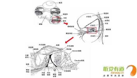 <span style="font-size:16px;"> 內耳或稱迷路,分為三個部分:半規管、前庭和耳蝸,負責聽覺的是耳蝸部分,外有骨殼,名骨迷路。耳蝸,顧名思義,像蝸牛殼一樣,耳蝸旋繞2.5~2.75圈。骨迷路的內壁被骨性螺旋板分成三部分,這三部分組成了三個錐形管腔(階),外面兩層含有淋巴液,頂部是前庭階,底部是鼓階,中間較小的三角形管腔是中階,又叫膜迷路,其中含有聽神經末梢分支。</span></p><p><span style="font-size:16px;"> </span></p><center><span style="font-size:16px;"><img alt="" src="/upfiles/20181116011946651.png" width="440" height="250" /></span></center><p></p><p><span style="font-size:16px;"> 骨迷路(右)</span></p><p><span style="font-size:16px;"> 鐙骨底板在卵圓窗里活動,振動了前庭階的外淋巴液。前庭階和鼓階在蝸孔相匯合,鼓階的另一端是圓窗,正好在卵圓窗和鐙骨底板的下方。中階被薄膜包裹,處于前庭階和鼓階之間,并與它們完全隔離。鐙骨底板在聲波的作用下,推動卵圓窗,使耳蝸內的淋巴液產生波動。顳骨很硬,淋巴液的壓力不能使之產生任何活動,因此,當鐙骨底板向里推動淋巴液時,淋巴液應有一個去處,圓窗部位就是淋巴液流動的方向。中階和前庭階有極薄的膜相隔離,而基底膜分隔中階和鼓階,基底膜是中階里螺旋器的根據地。中階的外壁由螺旋韌帶和微血管叢組成。血管叢可分泌內淋巴液,是內淋巴液化學成分的主要來源,內淋巴液是維持毛細胞功能的必要物質。基底膜上有支柱細胞、內毛細胞、外毛細胞和膠狀蓋膜等形成的螺旋器,又名Corti’s器。</span></p><p><span style="font-size:16px;"> </span></p><center><span style="font-size:16px;"><img alt="" src="/upfiles/201811160119529073.png" width="440" height="250" /></span></center><p></p><p><span style="font-size:16px;"> 耳蝸截面圖</span></p><p><span style="font-size:16px;"> 毛細胞是聽覺細胞,3500個內毛細胞和12000個外毛細胞很有序的排列著。普遍認為是外毛細胞比內毛細胞敏感35dB,因此更容易被大聲和耳毒藥物損害。蓋膜是一種膠狀物質,內側附在支持細胞上,其余部分覆蓋著毛細胞。毛細胞上的纖毛叢就埋在蓋膜里。淋巴液的波動或蓋膜的運動,可影響到毛細胞。淋巴液的波動使蓋膜產生猶如鋼琴鍵般的“剪切運動”,刺激毛細胞底部的神經末梢,產生神經沖動。耳蝸底部,離卵圓窗最近處,對高頻發生響應,耳蝸頂部,即遠離卵圓窗的地方,對低頻發生響應,中頻響應介于頂和底之間。</span></p><p><span style="font-size:16px;"> 更多詳情請登錄www.letianwh.cn</span></p>" />