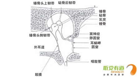<span style="font-size:16px;"> 中耳結(jié)構(gòu)包括鼓室、咽鼓管、鼓竇和乳突腔四部分。鼓室內(nèi)有聽骨、肌肉、韌帶和神經(jīng)。中耳是換能器,換能是將一種能量形式轉(zhuǎn)換成另一種能量形式,中耳通過鼓膜和聽骨鏈將聲能轉(zhuǎn)換為機(jī)械能,再由鐙骨底板將機(jī)械能轉(zhuǎn)換為內(nèi)耳的液態(tài)能。</span></p><p><span style="font-size:16px;"> 鼓膜是中耳和外耳的分界,呈橢圓形,中間稍向內(nèi)凹陷,色灰白,較透明,與耳道底約呈30°角。鼓膜寬約8mm,高約9mm,厚0.1mm,質(zhì)地韌,其構(gòu)造分三層:外層是皮膚層,中層由淺層的放射狀和深層的環(huán)狀纖維組成,它們使得鼓膜能承受一定的氣壓和水壓并抗感染,內(nèi)層為粘膜層,與鼓室粘膜相連續(xù)。聲音的振動(dòng),即聲能,通過耳郭和耳道共振的加強(qiáng),引起鼓膜隨之振動(dòng),鼓膜與中耳的錘骨相連,在正常耳,錘骨懸掛在自鼓膜頂端至下2/3處。錘骨柄的尖端將鼓膜頂向中耳,形成錐形鼓膜的頂,稱作臍。自臍向前下達(dá)鼓膜邊緣有一個(gè)三角形的反光區(qū),名光錐,是外來光線被鼓膜的凹面集中反射而成。鼓膜下4/5為緊張部,上1/5由于缺乏纖維層而較松馳,稱為松弛部。鼓膜可分為前上、前下、后上、后下四個(gè)象限。兒童的鼓膜薄而有彈性,年齡越大,鼓膜越厚且越僵硬。鼓環(huán)將鼓膜固定在某一位置,使其成為在外耳和中耳之間的一層防水防氣的屏障。</span></p><center><span style="font-size:16px;"><img alt="" src="/upfiles/201810080137189845.png" width="440" height="250" /></span></center><p></p><p><span style="font-size:16px;"> 中耳鼓室</span></p><center><span style="font-size:16px;"><img alt="" src="/upfiles/201810080137242362.png" width="440" height="250" /></span></center><p></p><p><span style="font-size:16px;"> 正常鼓膜像(左)</span></p><p><span style="font-size:16px;"> 在中耳腔內(nèi)的聽骨是人體最小的骨頭,分別叫作錘骨、砧骨和鐙骨。這些聽骨由韌帶連接并懸掛起來形成了聽骨鏈。錘骨柄附在鼓膜上,錘骨頭與砧骨頭形成錘砧關(guān)節(jié),砧骨底與鐙骨頭形成砧鐙關(guān)節(jié),鐙骨底板由環(huán)狀韌帶固定在卵圓窗上。聽骨鏈利用杠桿原理使來自鼓膜的機(jī)械能放大,傳遞到卵圓窗。</span></p><center><span style="font-size:16px;"><img alt="" src="/upfiles/201810080137303051.png" width="440" height="250" /></span></center><p></p><p><span style="font-size:16px;"> 聽骨鏈</span></p><p><span style="font-size:16px;"> 咽鼓管是中耳通氣引流的唯一途徑,也是中耳感染的主要途徑。它的一端開口在較高的中耳鼓室腔,另一端開口在較低的鼻咽部,通過咽鼓管在鼻咽部的開口,空氣可從外界直接進(jìn)入中耳腔。咽鼓管平時(shí)處于關(guān)閉狀態(tài),能較好的防止細(xì)菌感染,只有在咳嗽、擤鼻涕、打哈欠或吞咽時(shí),咽鼓管才開放。當(dāng)咽鼓管開放時(shí),根據(jù)鼓膜外側(cè)的壓力情況,空氣或者從中耳流向外界,或者從外界流向中耳,使中耳壓力得以平衡。</span></p><p><span style="font-size:16px;"> 更多詳情請登錄www.letianwh.cn</span></p>" />