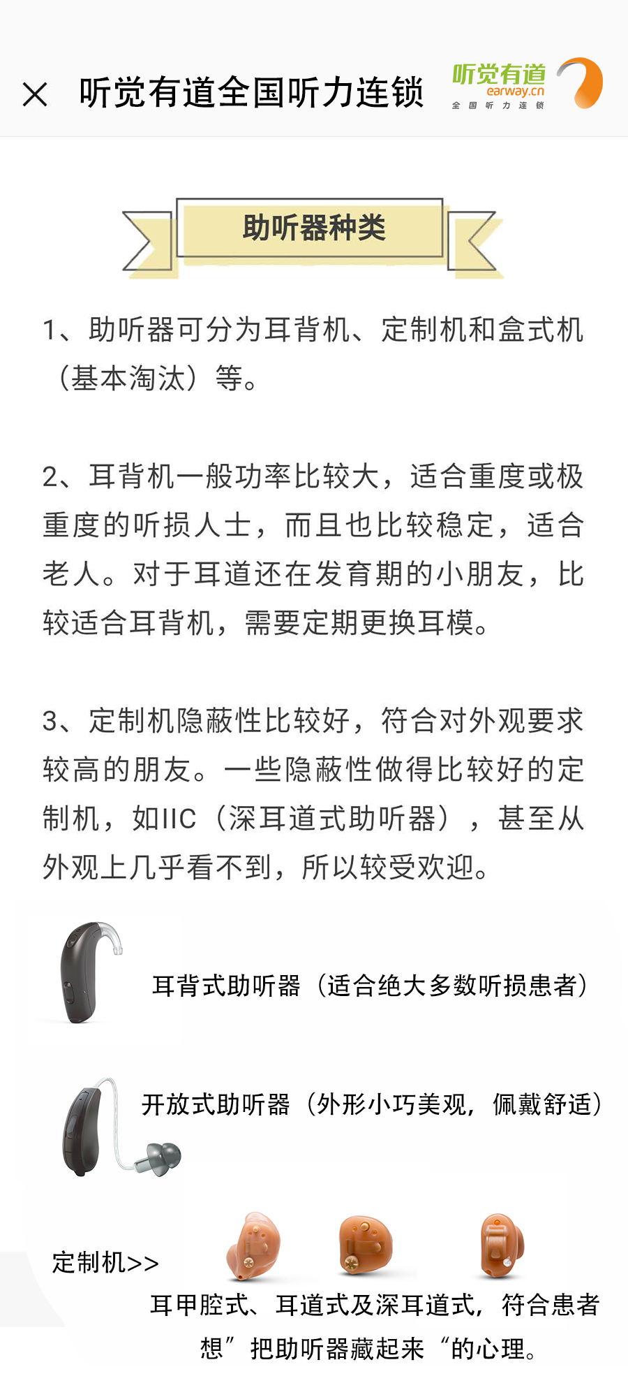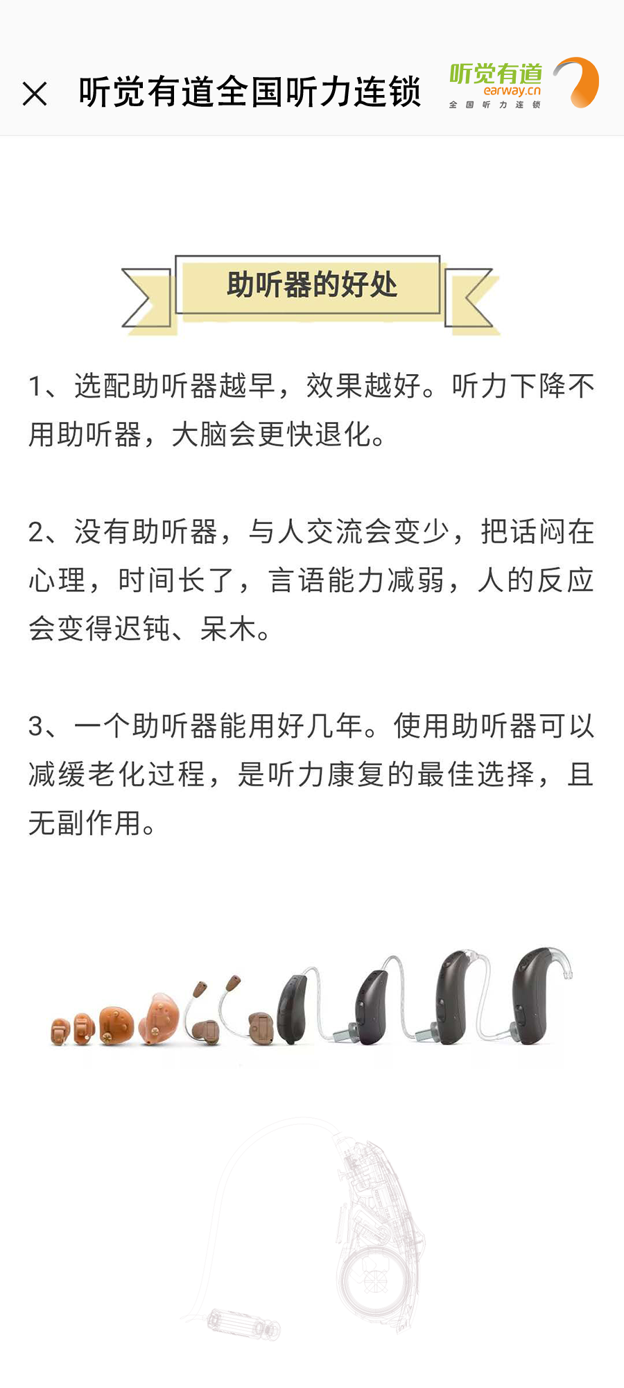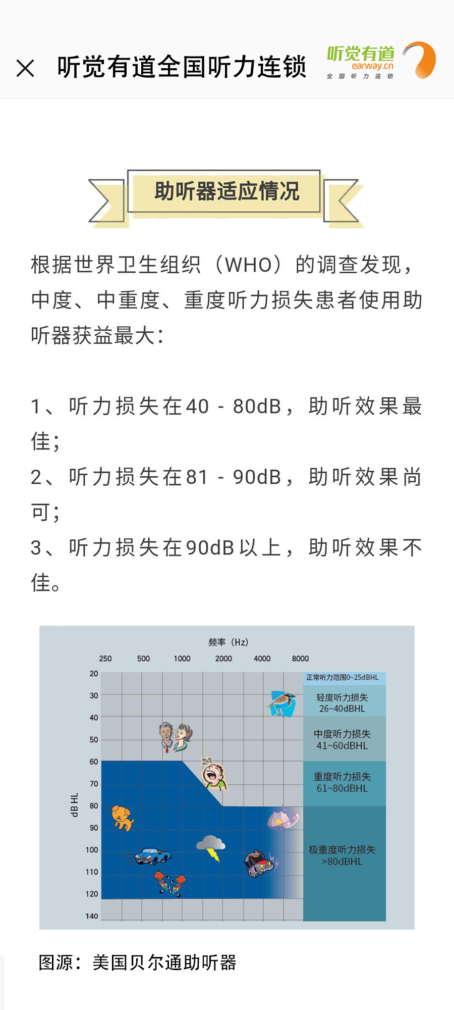 什么是助聽器?長什么樣子?有什么作用?如何使用?這里一一告訴您!</p><p> 助聽器是聽力障礙者使用的輔具,用來補足聽力損傷所造成的缺陷。廣義上講凡能有效地把聲音傳入耳朵的各種裝置都可以看作為助聽器,狹義上講助聽器是一個電聲放大器,通過它將聲音放大,使聽障者聽到了原來聽不清楚、聽不到的聲音。</p><p> 第一:助聽器的種類</p><p style="text-align: center;"><img src="/upfiles/201901180318143583.jpg" width="640" alt="" /><br /></p><p> 第二:助聽器的好處</p><p style="text-align: center;"><img src="/upfiles/201901180318334139.png" width="640" alt="" /><br /></p><p> 第三:如何適應(yīng)助聽器</p><p style="text-align: center;"><img src="/upfiles/201901180318506440.jpg" width="640" alt="" /><br /></p><p> 第四:選配助聽器流程</p><p style="text-align: center;"><img src="/upfiles/201901180319039646.jpg" width="640" alt="" /><br /></p><p style="text-align: center;"><br /></p><p> 更多詳情請登錄www.letianwh.cn</p>" />