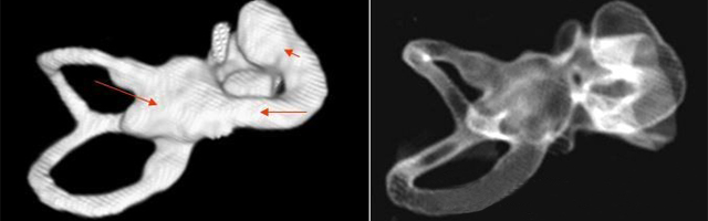 先天性內耳畸形的疾病種類繁多,診斷比較困難,隨著高分辨CT和磁共振(MRI)的應用,目前診斷率不斷提高。臨床常見的內耳畸形包括大前庭導水管綜合癥、先天性耳蝸畸形、米歇爾聽障及沙伊貝聽障。本篇將后三種畸形介紹如下:</p><p> 先天性耳蝸畸形(Congenital cochlear malformation)</p><p> 先天性耳蝸畸形又稱Mondini內耳發育不全,是最常見的一種內耳畸形。</p><p> 1、病因</p><p> 本病可為常染色體顯性或隱性遺傳病,也可為非遺傳性因素,如風疹病毒感染、過多的放射線暴露以及反應停類藥物等引起。</p><p> 2、臨床表現</p><p> 先天性耳蝸畸形包括耳蝸扁平、耳蝸發育不良,特別是第二圈和頂圈發育不良,兩者合并為一個腔;前庭擴大,巨大的前庭導水管以及半規管畸形、內耳道擴大等癥。在具體病例中不一定以上所有的畸形同時出現,可僅出現其中一種或幾種畸形。</p><p> 3、聽力學表現</p><p> 出生即無聽力,或1~2歲時才出現聽力減退,主要為感音神經性聽障,部分可為混合性聽障,有部分患者可長期保存殘余聽力。個別患者可有眩暈發作。</p><p> 4、診斷</p><p> 主要根據聽力學表現和影像學檢查。通過高分辨CT可看到耳蝸畸形。內耳MRI顯示膜迷路內水充盈,耳蝸扁平,耳蝸第二圈與頂圈間隔缺損,以及半規管、前庭的畸形。</p><p> </p><center><img alt="" src="/upfiles/201903250158493159.png" width="640" height="200" /></center><p></p><p> 先天性耳蝸畸形伴前庭和外半規管發育不良</p><p> 5、治療</p><p> 目前尚無有效的治療方法。如有殘余聽力,可佩帶助聽器后進行語言康復。無殘余聽力或極重度聽障患者可考慮人工耳蝸植入。</p><p> 米歇爾聽障(Michel’s deafness)</p><p> 屬常染色體顯性遺傳,是最嚴重的內耳畸形,內耳可完全未發育,可伴有其它器官的畸形和智力障礙。</p><p> 1、診斷</p><p> 主要依靠顳骨高分辨CT和內耳MRI。</p><p> </p><center><img alt="" src="/upfiles/201903250158577271.png" width="640" height="160" /></center><p></p><p> 雙側內耳畸形:左側無內耳迷路及內耳道機構,為米歇爾畸形;右側空耳蝸及前庭擴大,為先天性耳蝸畸形</p><p> 2、治療</p><p> 目前無特殊辦法,此類病例不適合行人工耳蝸植入術,但是聽覺腦干植入術的適應癥,其效果有待進一步證實。</p><p> 沙伊貝聽障(Scheibe dysplasia)</p><p> 為常染色體隱性遺傳,是最輕的內耳畸形,畸形僅限于蝸管和球囊,故又稱耳蝸球囊型畸形。</p><p> 1、診斷</p><p> 主要根據先天性聽損和MRI檢查</p><p> 2、治療</p><p> 此病可選擇性地行人工耳蝸植入術。</p><p> 更多詳情請登錄聽覺有道助聽器www.letianwh.cn</p>" />
