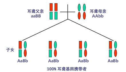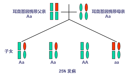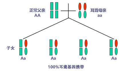 聽(tīng)力正常有時(shí)只是“表象”,如果骨子里“隱藏”著聽(tīng)損致病基因,這代“躲”過(guò)了聽(tīng)力損失,可是下一代、下下一代呢?</p><p> 生活中我們會(huì)發(fā)現(xiàn),有一些父母雙方都有正常的聽(tīng)力,但生出的孩子卻患有遺傳性聽(tīng)力損失,很多人都會(huì)感到詫異,甚至父母本身都無(wú)法相信自己竟然生出了弱聽(tīng)的孩子。</p><p> 其實(shí),此類“怪異事情”的發(fā)生離不開(kāi)基因的作用,這與遺傳性聽(tīng)損中的常染色體隱性遺傳密切相關(guān)。</p><p> 今天就帶大家看看:常染色體隱性遺傳性聽(tīng)損是怎么一回事?它有什么特點(diǎn)呢?基因又是如何“從中作祟”的呢?</p><p> 先來(lái)說(shuō)說(shuō)隱性遺傳為什么“隱藏”在骨子里</p><p> 俗話說(shuō),龍生龍,鳳生鳳,老鼠的兒子會(huì)打洞。這些表現(xiàn)都是基因所賦予的、與生俱來(lái)的,我們稱這種表現(xiàn)是顯性的。但有時(shí),即便你骨子里帶著那份基因,可是沒(méi)有表現(xiàn)出來(lái)。</p><p> 例如上文說(shuō)到的,父母雙方聽(tīng)力正常,但其實(shí)他們?nèi)杂新?tīng)損致病基因,這種表現(xiàn)就叫隱性。</p><p> </p><center><img alt="" src="/upfiles/201904260337585875.png" width="440" height="250" /></center><p></p><p> 接著說(shuō)說(shuō)常染色體隱性遺傳性聽(tīng)損“隱藏”的聽(tīng)力損失</p><p> 常染色體隱性遺傳性聽(tīng)損是指與聽(tīng)力損失表型相關(guān)的基因位于常染色體上,是最常見(jiàn)的遺傳性聽(tīng)損,約占80%。 一般而言,這類聽(tīng)力損失多指非綜合征型聽(tīng)損,即聽(tīng)力下降是其唯一臨床表現(xiàn),大多數(shù)患者癥狀早發(fā)且程度較重。</p><p> 這類聽(tīng)力損失只有在來(lái)自父母的等位基因均攜帶致病突變時(shí)才出現(xiàn)聽(tīng)力下降。</p><p> </p><center><img alt="" src="/upfiles/201904260338048765.png" width="440" height="250" /></center><p></p><p> 根據(jù)人類基因組命名委員會(huì)的規(guī)則,以DFNB來(lái)表示常染色體隱性遺傳性聽(tīng)損。</p><p> 第一個(gè)致病基因座位表述為DFNB1,此后依據(jù)基因座發(fā)現(xiàn)及獲得命名的時(shí)間順序,依次命名為DFNB2,DFNB3……</p><p> 目前,常染色體隱性遺傳的基因座位一共有86個(gè)。其中DFNB1和DFNB18中各有兩個(gè)聽(tīng)損致病基因,其他為各一個(gè)聽(tīng)損致病基因。</p><p> 例如,GJB2基因是中國(guó)人最常見(jiàn)的聽(tīng)損致病基因,在兒童非綜合征聽(tīng)損中占40%,其基因座位為DFNB1。</p><p> </p><center><img alt="" src="/upfiles/201904260338091241.png" width="440" height="250" /></center><p></p><p> 聽(tīng)損隱性遺傳表現(xiàn)各式各樣不是想“躲”就能“躲”</p><p> 涉及到不同聽(tīng)損致病基因的共同作用,常染色體隱性遺傳方式有很多,下面就以最常見(jiàn)且最簡(jiǎn)單的方式進(jìn)行舉例分析:</p><p> 1. 父母雙方聽(tīng)力正常,都為聽(tīng)損致病等位基因的攜帶者(Aa),則子女中有25%的概率患有聽(tīng)力損失,50%的概率為聽(tīng)損致病基因攜帶者。</p><p> </p><center><img alt="" src="/upfiles/201904260338147337.png" width="440" height="250" /></center><p></p><p> 2. 父母雙方都患有聽(tīng)力損失,且聽(tīng)損致病基因?yàn)榈任换?aa),則子女基因都為(aa),100%患有聽(tīng)力損失,也就是代代相傳。</p><p> </p><center><img alt="" src="/upfiles/20190426033818859.png" width="440" height="250" /></center><p></p><p> 3. 父母一方為聽(tīng)力正常者(AA),另一方患有聽(tīng)力損失(aa),則子女基因都為(Aa),即聽(tīng)力正常的聽(tīng)損致病基因攜帶者。</p><p> </p><center><img alt="" src="/upfiles/201904260338249987.png" width="440" height="250" /></center><p></p><p> 4. 父母一方為聽(tīng)力正常的聽(tīng)損致病基因攜帶者(Aa),另一方患有聽(tīng)力損失(aa),則子女基因50%的概率為聽(tīng)力正常但攜帶聽(tīng)損致病基因(Aa),50%的概率患有聽(tīng)力損失(aa)。</p><p> </p><center><img alt="" src="/upfiles/201904260338297827.png" width="440" height="250" /></center><p></p><p> 5. 父母雙方都有聽(tīng)力損失,但非等位基因,父親為(aaBB),母親為(AAbb),則子女基因都為AaBb,即100%的概率聽(tīng)力正常。</p><p> </p><center><img alt="" src="/upfiles/201904260338427827.png" width="440" height="250" /></center><p></p><p> 常染色體隱性聽(tīng)損遺傳的特征下一代“躲”得過(guò)嗎?根據(jù)如上分析,我們可以總結(jié)常染色體隱性遺傳性聽(tīng)損具有以下特征:</p><p> 1. 聽(tīng)損致病基因位于常染色體,因而聽(tīng)損致病基因的遺傳與性別無(wú)關(guān),即男、女性的患病機(jī)會(huì)均等;</p><p> 2. 系譜中通常看不到連續(xù)傳遞現(xiàn)象,往往是散發(fā)病例,但同胞中可有多人患病;</p><p> 3. 患者的雙親一般不患病,但都是致病基因的攜帶者;</p><p> 4. 患者的同胞有1/4的風(fēng)險(xiǎn)患病,患者表型正常的同胞中有2/3的概率為攜帶者;</p><p> 5. 患者的后代一般不發(fā)病,但一定是聽(tīng)損致病基因攜帶者;</p><p> 6. 近親婚配時(shí),子女的發(fā)病風(fēng)險(xiǎn)顯著提高,因?yàn)楣餐淖嫦瓤赡軅鬟f給他們共同的突變基因。</p><p> </p><center><img alt="" src="/upfiles/201904260338494272.png" width="440" height="250" /></center><p></p><p> 可見(jiàn),遺傳性聽(tīng)損有多種多樣的表現(xiàn)形式,需要細(xì)分遺傳模式。 父母的不同表型和不同聽(tīng)損致病基因決定了其后代各種各樣的表現(xiàn)形式。<