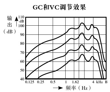 5)增益控制(GC)和音量調控(VC)用于調節全頻段的主聲增益,佩戴者感覺到的是整體響度的大小變化,通常VC的調節范圍小于GC。