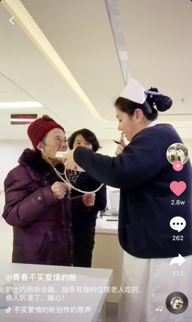 友好醫院工作人員把這段視頻做成一條抖音視頻,以網名“青春不買愛情的帳”發送?!扒啻翰毁I愛情的帳”說,本來就想與同事和朋友分享一下醫院護士既機智又暖心的行為,沒想到僅一天的工夫,竟獲百萬點擊量,數萬個贊。