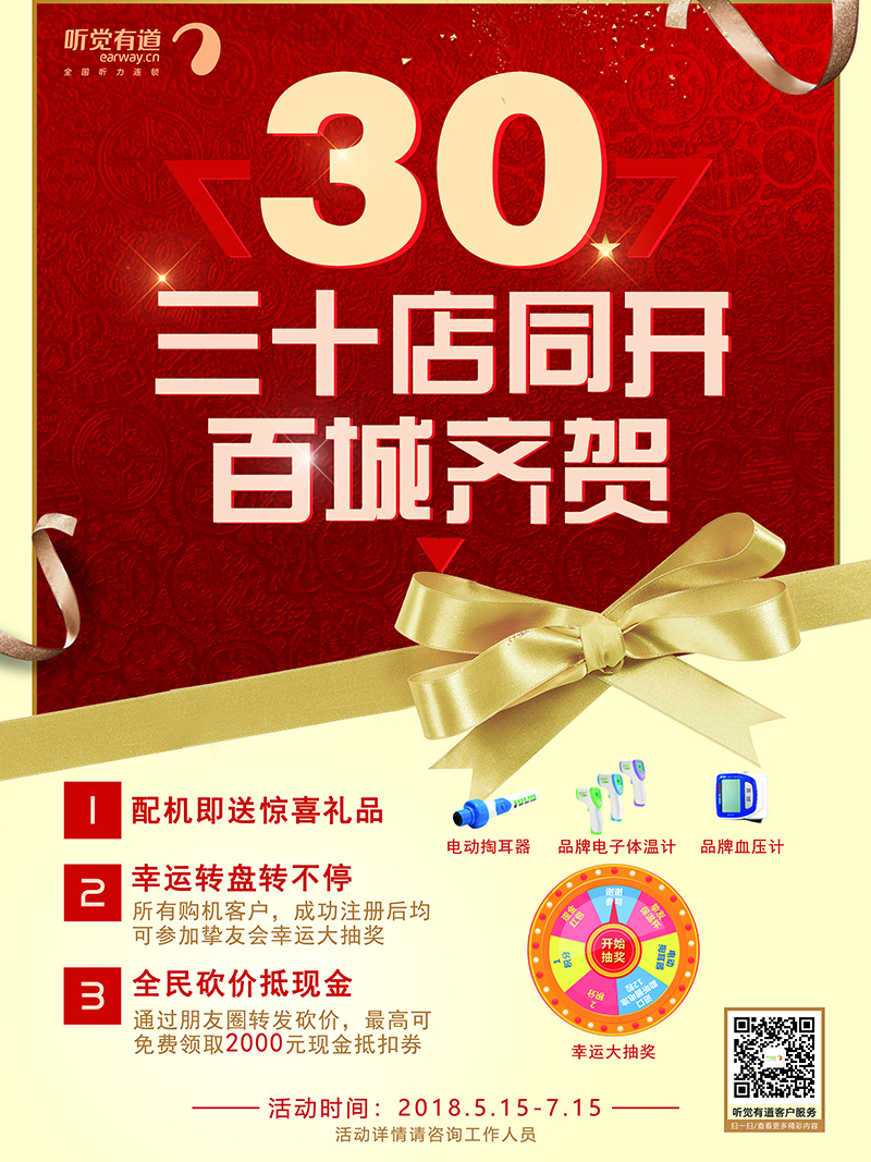 <span style="font-size:16px;"><img src="/upfiles/201805140533309372.jpg" alt="" /><br /></span></p><p style="text-align: center;"><span style="font-size:16px;"><br /></span></p><p><span style="font-size:16px;"> 聽覺有道助聽器驗配中心30家門店于5月15日正式開業,百城同慶!</span></p><p><span style="font-size:16px;"> 聽覺有道是一家高端、專業的全國聽力連鎖機構,有著近30年的助聽器驗配經驗,是廣東聽覺有道企業管理有限公司旗下品牌。</span></p><p><span style="font-size:16px;"> 公司現有專家級驗配師400多名,驗配服務中心遍布華西、華東、華南、華北主要省市,同時與GN集團進行戰略合作,代理美國貝爾通助聽器等助聽器品牌,擁有多條產品線:聽力篩查聽力篩查,聽力診斷,平衡診斷,助聽器驗配及專家級軟件(聽力診斷設備操作系統與患者信息服務管理系統),行業內領先的無線藍牙助聽器通訊技術,為聽障朋友提供一站式助聽器驗配解決方案!</span></p><p><span style="font-size:16px;"> 作為助聽器驗配行業的專業服務者,專業的驗配環境,專家級的驗配師,將時刻秉承專業全面的服務、豐富的驗配經驗及先進的驗配設備,同時為聽障朋友提供康復指導及助聽器售后服務,讓聽障朋友更好更放心地傾聽!</span></p><p style="text-align: center;"><span style="font-size:16px;"> <strong>我們的新門店地址(30家):</strong></span></p><p><span style="font-size:16px;"></span></p><p></p><p style="text-align: center;"><span style="font-size:16px;"> <strong>聽覺有道華南高端驗配中心</strong></span></p><p style="text-align: center;"><span style="font-size:16px;"><strong><img src="/upfiles/201805151039587785.png" alt="" /><br /></strong></span></p><p style="text-align: center;"><span style="font-size:16px;"> 電話:020-87066099</span></p><p style="text-align: center;"><span style="font-size:16px;"> 地址:廣州市天河區體育東路122號羊城國際商貿中心西塔1108(地鐵體育中心B出口前行100米,專家坐診,只接受預約)</span></p><p style="text-align: center;"><span style="font-size:16px;"><br /></span></p><p style="text-align: center;"><span style="font-size:16px;"> <strong>聽覺有道內蒙古呼市烏蘭察布服務中心</strong></span></p><p style="text-align: center;"><span style="font-size:16px;"><strong><img src="/upfiles/201805151040168591.png" alt="" /><br /></strong></span></p><p style="text-align: center;"><span style="font-size:16px;"> 電話:0471-3977839、13514714042</span></p><p style="text-align: center;"><span style="font-size:16px;"> 地址:內蒙古呼和浩特市賽罕區烏蘭察布東街路北(招商考試中心旁)</span></p><p style="text-align: center;"><span style="font-size:16px;"><br /></span></p><p style="text-align: center;"><span style="font-size:16px;"> <strong>聽覺有道成都金堂服務中心</strong></span></p><p style="text-align: center;"><span style="font-size:16px;"><strong><img src="/upfiles/201805151040458276.png" width="500" alt="" /><br /></strong></span></p><p style="text-align: center;"><span style="font-size:16px;"> 電話:17780478558</span></p><p style="text-align: center;"><span style="font-size:16px;"> 地址:成都市金堂縣趙鎮十里大道300號(一橫道路口)</span></p><p style="text-align: center;"><span style="font-size:16px;"><br /></span></p><p style="text-align: center;"><span style="font-size:16px;"> <strong>聽覺有道四川雅安服務中心</strong></span></p><p style="text-align: center;"><span style="font-size:16px;"><strong><img src="/upfiles/201805151041171639.png" alt="" /><br /></strong></span></p><p style="text-align: center;"><span style="font-size:16px;"> 電話:17738307596</span></p><p style="text-align: center;"><span style="font-size:16px;"> 地址:雅安市雨城區大南街22號(天主教堂對面)</span></p><p style="text-align: center;"><span style="font-size:16px;"><br /></span></p><p style="text-align: center;"><span style="font-size:16px;"></span></p><p style="text-align: center;"><span style="font-size: 16px;"> <strong>聽覺有道東營廣饒服務中心</strong></span></p><p style="text-align: center;"><span style="font-size: 16px;"><strong><img src="http://www.letianwh.cn/upfiles/20180515104347120.png" alt="" /><br /></strong></span></p><p style="text-align: center;"><span style="font-size: 16px;"> 電話:0546-6281512</span></p><p style="text-align: center;"><span style="font-size: 16px;"> 地址:東營市廣饒縣花苑路與兵圣路十字路口東行20米路北(醫藥公司對面)</span></p><p style="text-align: center;"><span style="font-size: 16px;"><br /></span></p><p style="text-align: center;"><span style="font-size: 16px;"> <strong>聽覺有道河南洛陽服務中心</strong></span></p><p style="text-align: center;"><span style="font-size: 16px;"><strong><img src="http://www.letianwh.cn/upfiles/201805151044003400.png" alt="" /><br /></strong></span></p><p style="text-align: center;"><span style="font-size: 16px;"> 電話:0379-64324338、16637990858</span></p><p style="text-align: center;"><span style="font-size: 16px;"> 地址:河南省洛陽市澗西區景華路8號(潤峰廣場正對面)</span></p><p style="text-align: center;"><span style="font-size: 16px;"><br /></span></p><p style="text-align: center;"><span style="font-size: 16px;"> <strong>聽覺有道山東聊城服務中心</strong></span></p><p style="text-align: center;"><span style="font-size: 16px;"><strong><img src="http://www.letianwh.cn/upfiles/201805151044136324.png" alt="" /><br /></strong></span></p><p style="text-align: center;"><span style="font-size: 16px;"> 電話:0635-8800602,15653110810</span></p><p style="text-align: center;"><span style="font-size: 16px;"> 地址:山東省聊城市東昌府區興華西路2號(五星百貨斜對面)</span></p><p style="text-align: center;"><span style="font-size: 16px;"><br /></span></p><p style="text-align: center;"><span styl