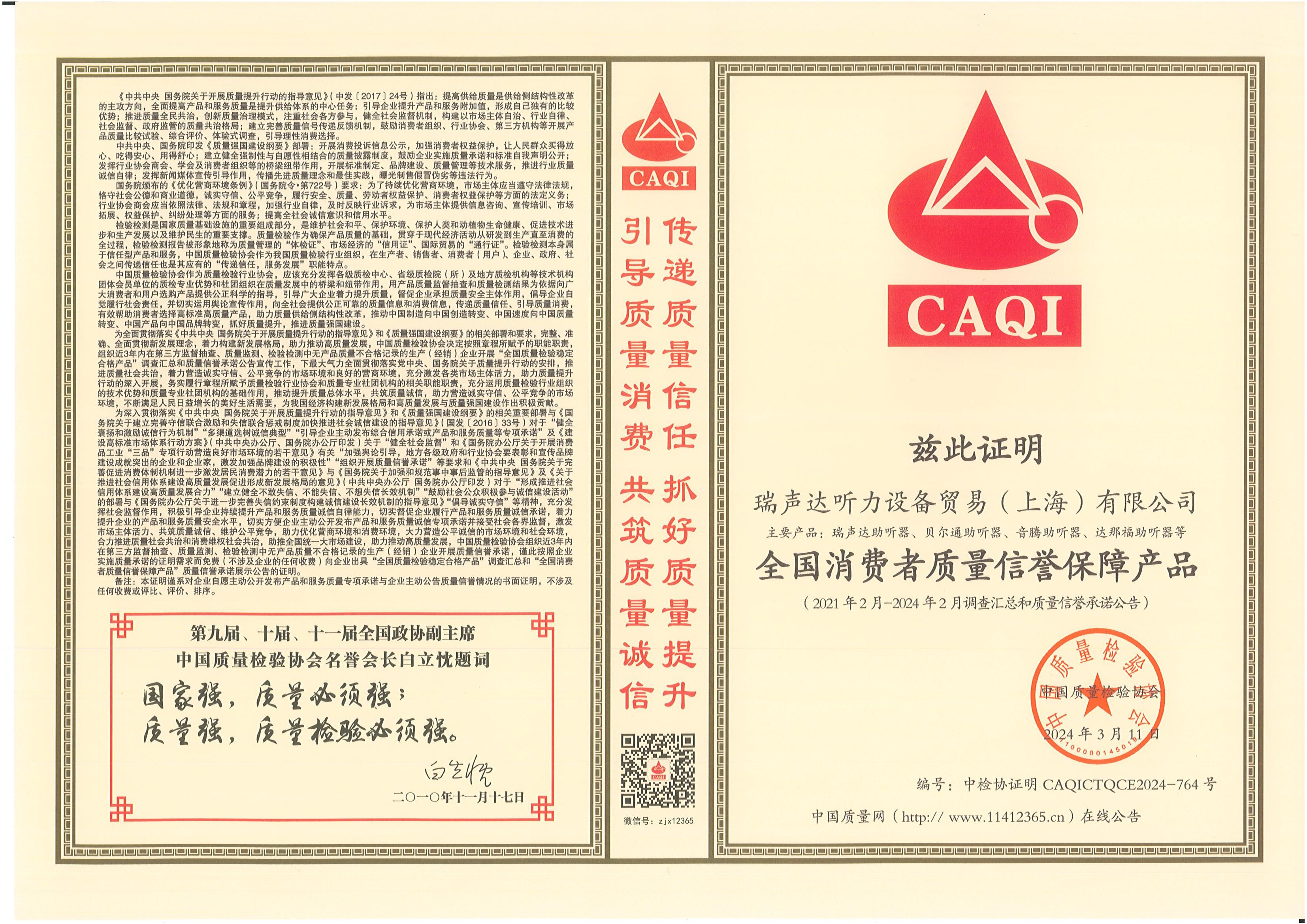 <span style="white-space:pre"> </span>2024年3月15日,是第42個國際消費者權益日,是全體消費者的共同節日。今年全國消協組織消費維權年主題是“激發消費活力”。<br /><br /> 作為對貝爾通助聽器產品的肯定,2024年中國質量檢驗協會再次頒發了四項榮譽證書,以期能引導用戶選擇高標準高質量的產品,優化消費環境,保護消費者權益。<br /></span><div style="text-align: center;"><br /></div><div style="text-align: center;"> 全國產品和服務質量誠信示范企業</div><p style="text-align: center;"><span style="font-size:16px;"><img src="/upfiles/202403150116348998.jpg" width="640" alt="" /><br /></span></p><p style="text-align: center;"><span style="font-size:16px;"> 全國聽力行業質量領先企業</span></p><p style="text-align: center;"><span style="font-size:16px;"><img src="/upfiles/202403150116524189.jpg" width="640" alt="" /><br /></span></p><span style="font-size:16px;"></span><div style="text-align: center;"><br /></div><p style="text-align: center;"><span style="font-size:16px;"> 全國消費者質量信譽保障產品</span></p><p style="text-align: center;"><span style="font-size:16px;"><img src="/upfiles/202403150117168442.jpg" width="640" alt="" /><br /></span></p><span style="font-size:16px;"></span><div style="text-align: center;"><br /></div><p style="text-align: center;"><span style="font-size:16px;"> 全國產品和服務質量誠信品牌</span></p><p style="text-align: center;"><span style="font-size:16px;"><img src="/upfiles/202403150117523284.jpg" width="640" alt="" /><br /></span></p><span style="font-size:16px;"><br /> 中國質量檢驗協會是國家市場監督管理總局主管下的質量檢驗行業組織和質量專業機構,為充分發揮名優企業、消費者之間的橋梁和紐帶作用,向廣大消費者提供權威可靠的質量信息,切實維護廣大名優產品生產企業及消費者的合法權益。<br /><br /> 中國質量檢驗協會連續多年頒發榮譽證書,不僅代表著對貝爾通助聽器產品質量的肯定,這同時也是一份承諾和職責,督促著我們持續為聽損用戶提供優質的產品和服務!</span>" />