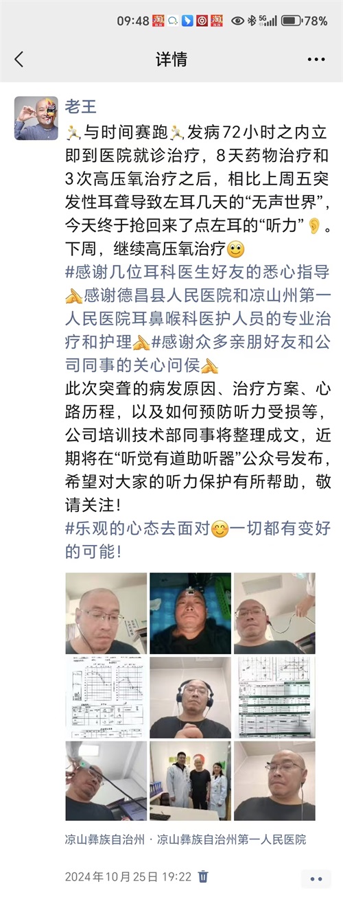 在這個(gè)快節(jié)奏的世界里,每一個(gè)細(xì)微的聲音都承載著生活的溫度。然而,突如其來的聽力挑戰(zhàn),卻讓這份美好變得模糊。<br /><br /><br />聽覺有道全國(guó)聽力連鎖聯(lián)合創(chuàng)始人王曉剛先生,期間或因工作過度操勞,于2024年10月16日的夜晚,耳道內(nèi)突然響起了一聲“砰”的異響。次日,他的耳內(nèi)又相繼出現(xiàn)了“噗噗”聲、“滋滋”聲的雜音,與人交談時(shí),聽不清、甚至聽不到對(duì)方的話語變得愈發(fā)顯著。<br /><br /></span><p><span style="font-size:16px;">以下任何一項(xiàng)癥狀單獨(dú)或突發(fā)性耳聾的發(fā)病原因及發(fā)病機(jī)制尚不明確,多認(rèn)為與病毒感染、腫瘤性病變、自身免疫疾病、藥物中毒內(nèi)耳缺血等因素相關(guān)。<br />過度勞累,焦慮、精神壓力及相關(guān)心理因素等被認(rèn)為是常見的誘發(fā)因素。伴隨出現(xiàn),均有可能是突發(fā)性聾:<br />1、突然發(fā)生的主觀聽力下降(但是根據(jù)聽力損失的程度以及頻率不同,不是所有的病人都有聽力下降的感覺)<br /><br /><br />2、耳鳴(約90%)<br /><br /><br />3、耳悶脹感(50%以上)<br /><br /><br />4、眩暈、惡心、嘔吐(30%~50%)<br /><br /><br />5、聽覺過敏或重振(表現(xiàn)為對(duì)聲音異常敏感或者異常遲鈍,導(dǎo)致刺耳感或者失真感)<br /><br /><br />6、耳周感覺異常:(如麻木感、針刺感等不適感覺(全聾患者常見))<br /></span></p><p><span style="font-size:16px;">18日下午,當(dāng)他嘗試堵住右耳,竟發(fā)現(xiàn)左耳幾乎無法捕捉到外界的任何聲響。此刻,王總深刻意識(shí)到,自己的聽力出現(xiàn)了嚴(yán)重問題,于是立即趕往當(dāng)?shù)蒯t(yī)院耳鼻喉科進(jìn)行檢查,最終被確診為突發(fā)性耳聾。</span></p><p><br /></p><p style="text-align: center;"><img src="/upfiles/202411140426063076.jpg" alt="" /><br /></p><p><br /></p><p><span style="font-size:16px;">回想起發(fā)病初期,王總表示,當(dāng)自己突然失去聽力,完全與外界隔絕的那一刻,內(nèi)心充滿了無助與恐懼。幸運(yùn)的是,由于他長(zhǎng)期深耕聽力行業(yè),對(duì)聽力受損有著較為深入的了解、明白:突聾聽力救治時(shí)間為黃金72小時(shí)內(nèi)。因此能夠識(shí)別癥狀并及時(shí)就醫(yī),從而得到了有效的治療。<br /><br /><br />然而,如今仍有許多患者對(duì)聽力健康的信息了解不足,錯(cuò)過了最佳的治療時(shí)機(jī),最終形成不可逆的聽力損傷,給日常生活、工作中帶來嚴(yán)重交流障礙。</span><br /></p><p><br /></p><p style="text-align: center;"><img src="/upfiles/202411140428078193.jpg" alt="" /><br /></p><p style="text-align: center;"><img src="/upfiles/202411140429087669.jpg" alt="" /><br /></p><p style="text-align: center;"><img src="/upfiles/202411140429178890.png" alt="" /><br /></p><p style="text-align: center;"><br /></p><p style="text-align: center;"><span style="font-size:16px;color:#ff9900;"><strong>什么是突發(fā)性耳聾?</strong></span></p><p style="text-align: center;"></p><div style="text-align: left;"><span style="font-size:16px;">醫(yī)學(xué)全名:突發(fā)性不明原因性聽力損失。</span></div><span style="font-size:16px;"></span><div style="text-align: left;"><br /></div><div style="text-align: left;"><br /></div><div style="text-align: left;">簡(jiǎn)稱:突聾</div><div style="text-align: left;"><br /></div><div style="text-align: left;"><br /></div><div style="text-align: left;">根據(jù)中國(guó)2015年版《突發(fā)性聾診斷和治療指南》,突發(fā)性耳聾目前定義為:是指72小時(shí)內(nèi)突然發(fā)生、原因不明的感音神經(jīng)性聽力損失,至少在相鄰的兩個(gè)頻率聽力下降≥20dBHL。</div><div style="text-align: left;"><br /></div><div style="text-align: left;"><br /></div><div style="text-align: left;">近年來“突發(fā)性耳聾”患者年輕化趨勢(shì)明顯,年輕人患病比例增加了三至四成。耳蝸中的聽覺毛細(xì)胞一旦受損,在一定時(shí)間內(nèi)得不到及時(shí)治療,將不能再生。</div><div style="text-align: left;"><br /></div><div style="text-align: left;"><br /></div><div style="text-align: center;"><strong><span style="color:#ff9900;">臨床表現(xiàn)</span></strong></div><p></p><p><span style="font-size:16px;">突聾一般單側(cè)發(fā)病,個(gè)別情況下可以雙側(cè)發(fā)病( 1/10雙側(cè));</span><br /></p><p><span style="font-size:16px;"><br /></span></p><p style="text-align: center;"><span style="font-size:16px;color:#ff9900;"><strong>原發(fā)狀態(tài)</strong></span></p><p><span style="font-size:16px;">以下任何一項(xiàng)癥狀單獨(dú)或伴隨出現(xiàn),均有可能是突發(fā)性聾:<br />1、突然發(fā)生的主觀聽力下降(但是根據(jù)聽力損失的程度以及頻率不同,不是所有的病人都有聽力下降的感覺)<br /><br /><br />2、耳鳴(約90%)<br /><br /><br />3、耳悶脹感(50%以上)<br /><br /><br />4、眩暈、惡心、嘔吐(30%~50%)<br /><br /><br />5、聽覺過敏或重振(表現(xiàn)為對(duì)聲音異常敏感或者異常遲鈍,導(dǎo)致刺耳感或者失真感)<br /><br /><br />6、耳周感覺異常:(如麻木感、針刺感等不適感覺(全聾患者常見))<br /></span></p><p><span style="font-size:16px;"><br /></span></p><p style="text-align: center;"><span style="font-size:16px;color:#ff9900;"><strong>繼發(fā)狀態(tài)</strong></span></p><p><span style="font-size:16px;">恐懼,焦慮;耳鳴帶來的心理、睡眠干擾等,嚴(yán)重影響生活質(zhì)量。<br /></span></p><p><span style="font-size:16px;"><br /></span></p><p style="text-align: cent